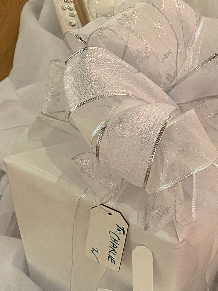 White gift wrapping with trinkets